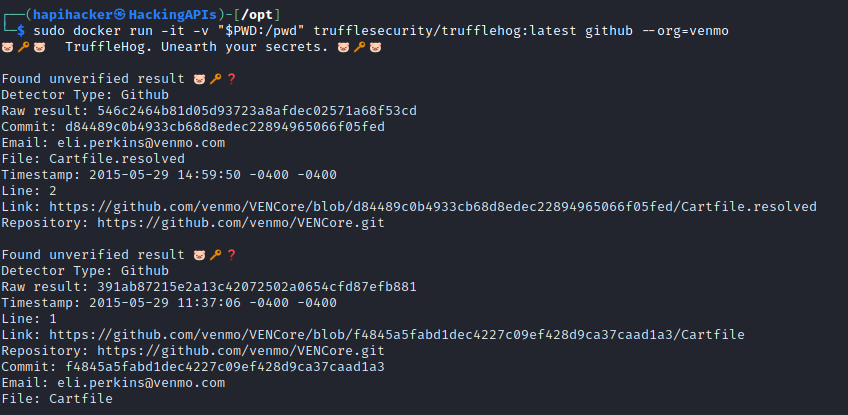 $ sudo docker run -it -v "$PWD:/pwd" trufflesecurity/trufflehog:latest github --org=target-name