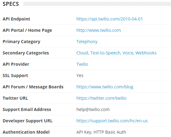 The Twilio specs page on programmableweb.com.