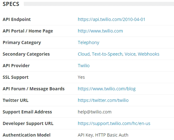 On the Twilio specs page, you can learn all sorts of useful information about the API. For instance, the API endpoint URL is listed, the forum for the API, the developer support URL, the authentication model, and more are all listed on this page. At the bottom of the Specs page, you can also see articles related to the API and developers of the API, all of which could prove useful when attacking the API.