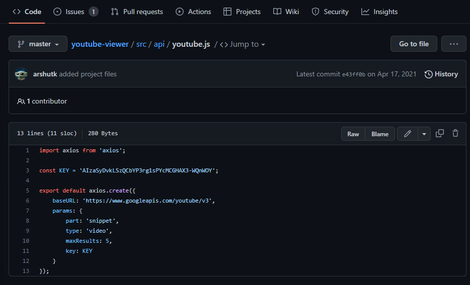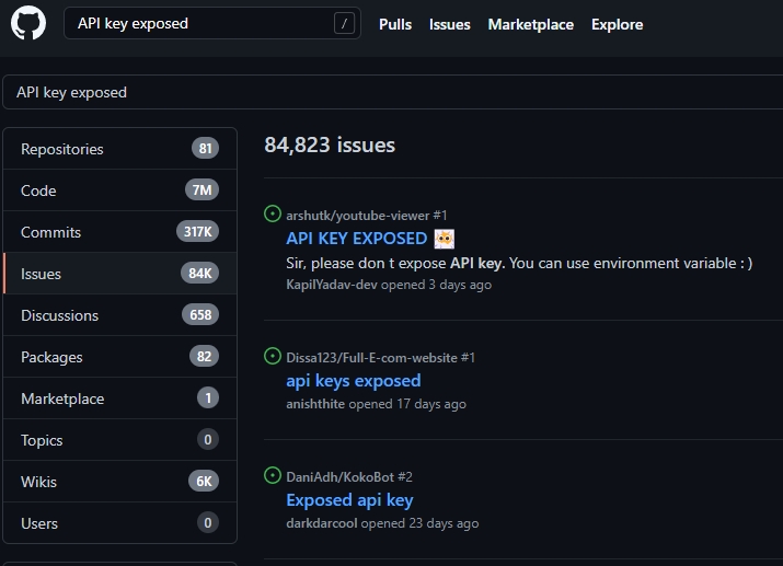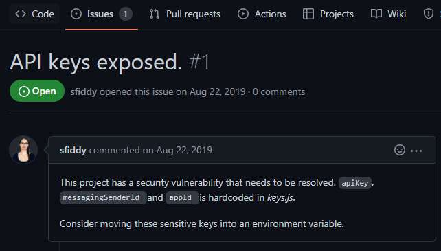 This is an example, of an open GitHub issue that provides the exact location of an exposed API key in the code of an application. If the issue is closed, note the date of the issue and then search the commit history for any changes around that time.