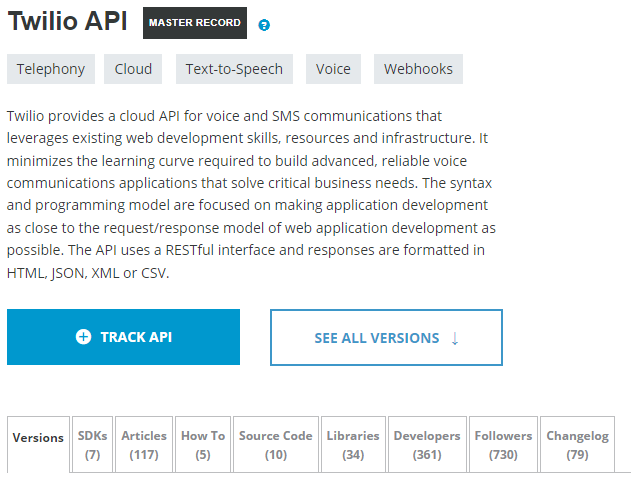 Twilio API page on programmableweb.com.