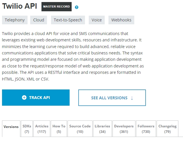 Click through the various tabs in the directory listing and note the information you find. To see the API endpoint location, portal location, and authentication model. To see information about the APIs version history, select a specific version listed under the Versions tab. In this case, both the portal and endpoint links lead to API documentation as well. In the case of Twilio, you can see all the specs related to the current version of the REST API.