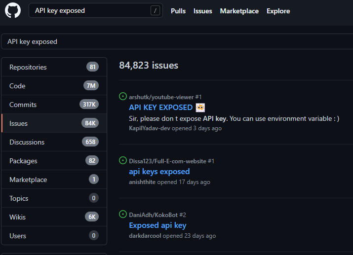 Begin by searching GitHub for your target organization’s name paired with potentially sensitive types of information, such as “api key,” "api keys", "apikey", "authorization: Bearer", "access_token", "secret", or “token.” Then investigate the various GitHub repository tabs to discover API endpoints and potential weaknesses. Analyze the source code in the Code tab, find bugs in the Issues tab, and review proposed changes in the Pull requests tab.