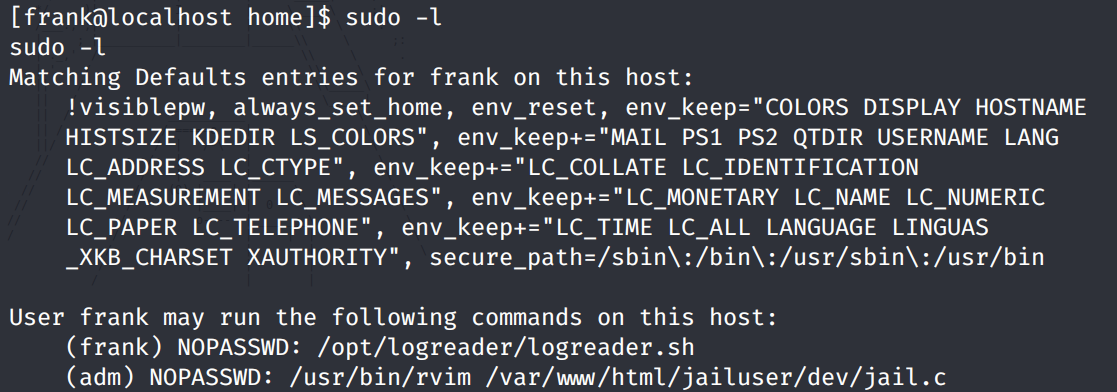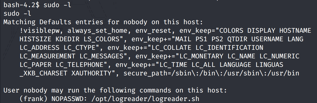 We’re allowed to run the logreader.sh file as the user frank without having to enter frank’s password.