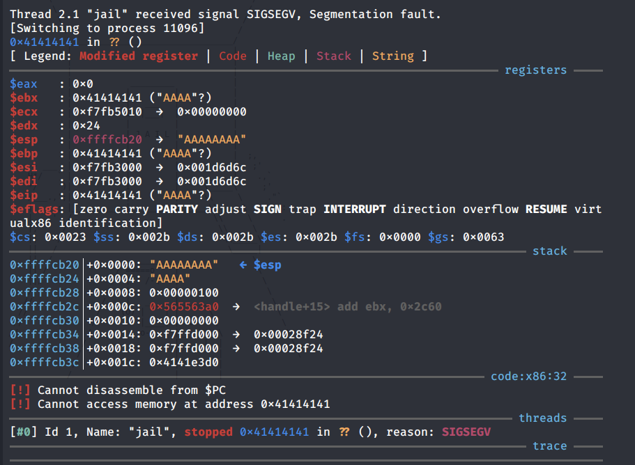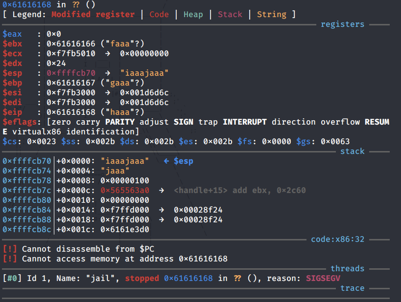 The EIP was overwritten with the string “haaa”. To find exact memory address of the EIP, use the following command.