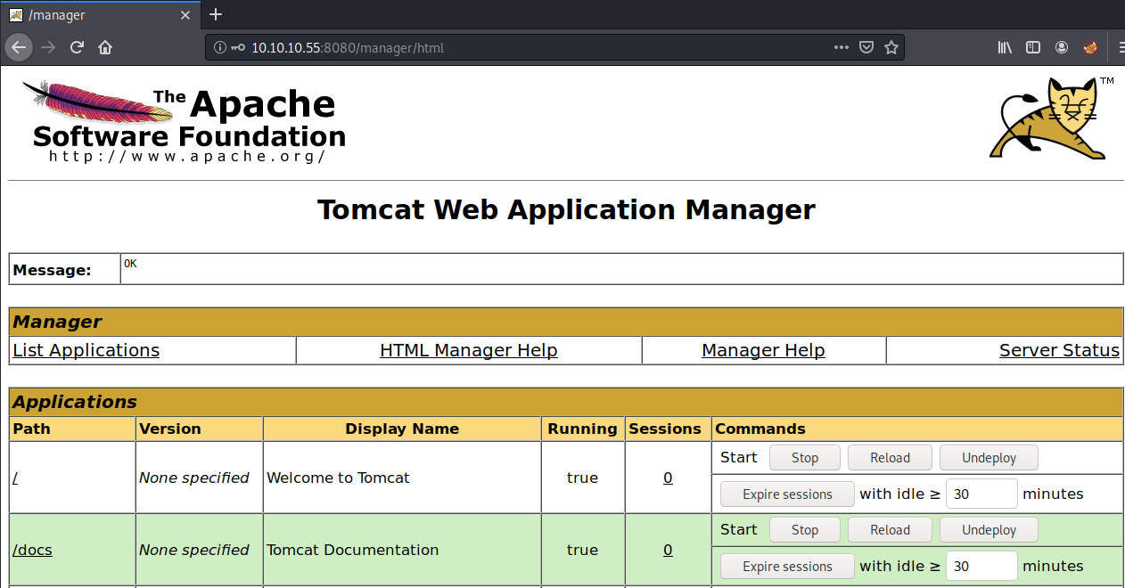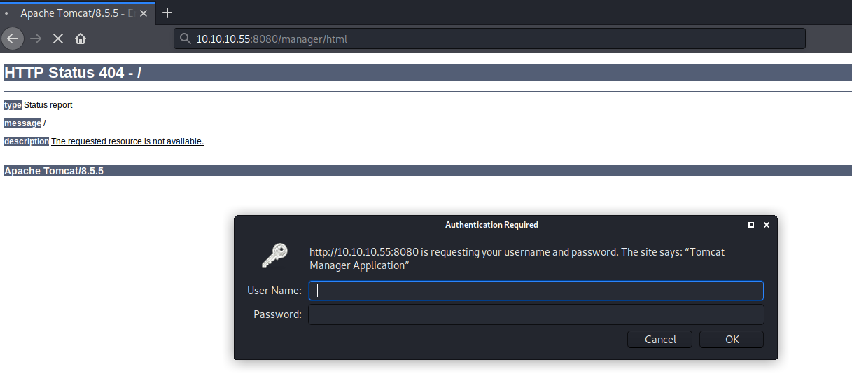 Port 8080 is running Apache Tomcat and the nmap scan found the /manager/html page, which is the login page to the Manager interface. We’ll have to test that for default credentials. If we do get access to the application we can simply deploy a war file that sends a reverse shell back to our attack machine.
