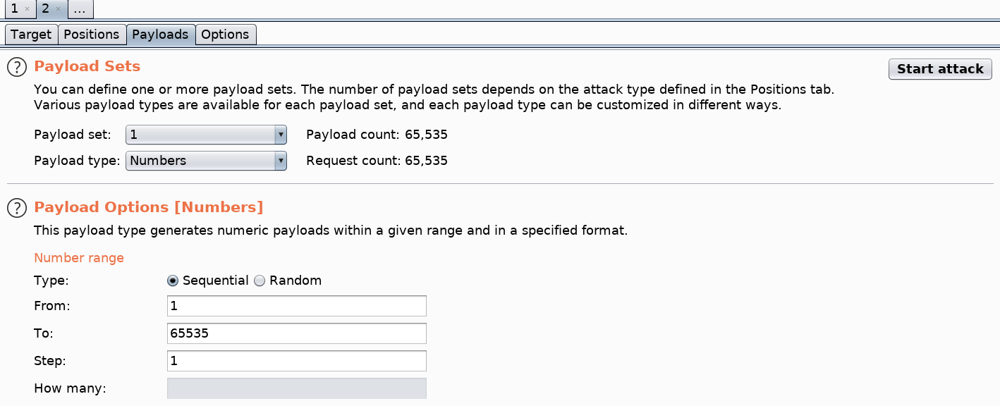 Next, select the Payloads sub tab > select the Payload type option to be Numbers > the Type to be Sequential from the range 1 to 65535. This will loop through all the possible ports.