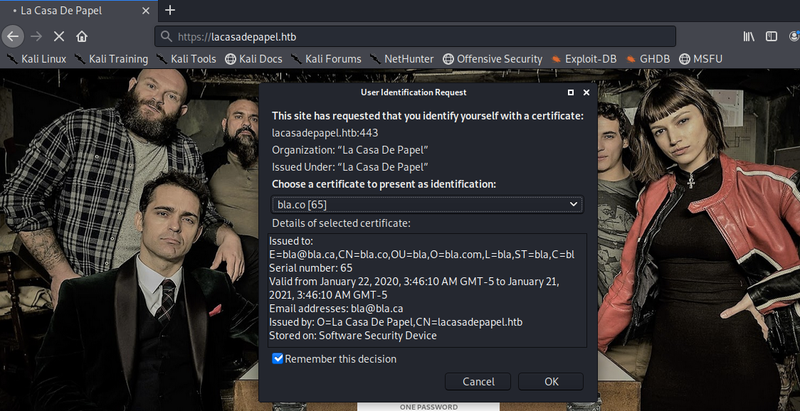 Open Burp and click on User Options > SSL > Client SSL Certificates > Add. In the Destination host field, add lacasadepapel.com and select the File (PKCS#12) option_._ Click Next and import the client cert. Now, we can intercept requests using Burp.