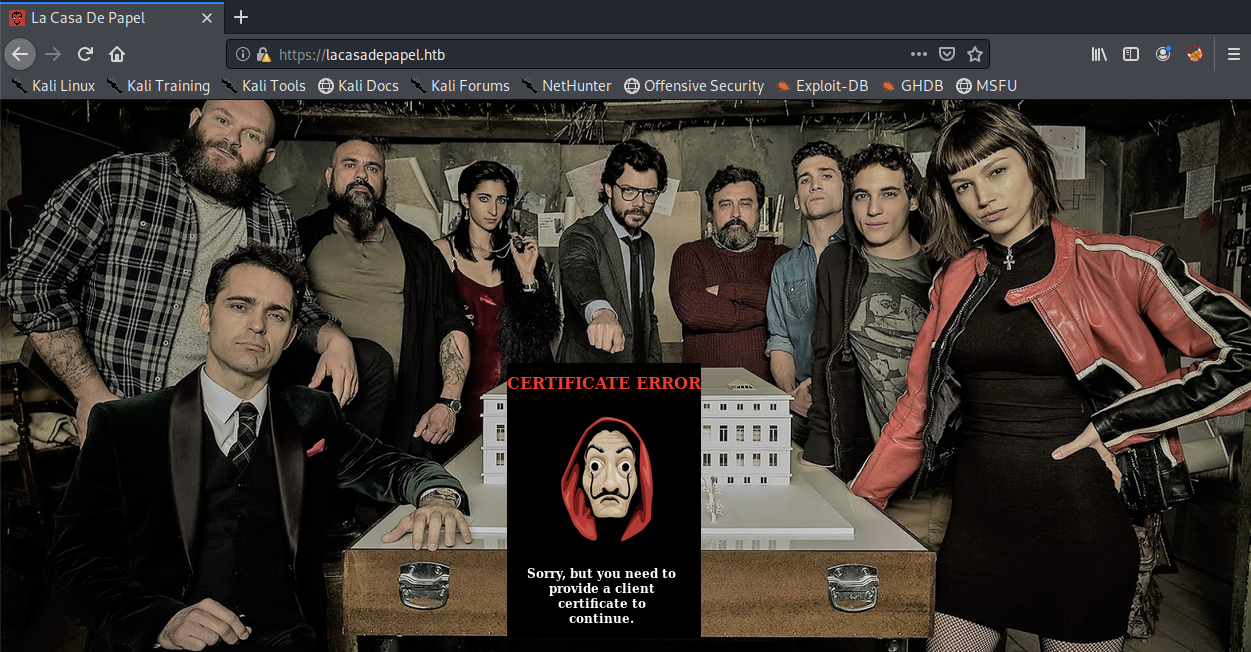 We get a certificate error informing us that we need to provide a client certificate before we can view any other content. Interesting. This is the first time I encounter an HTB machine that is using mutual TLS authentication.