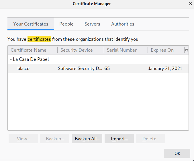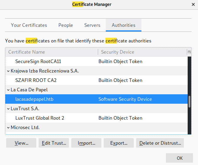 In the above Certificate Manager window, click on the Authorities tab and find the La Casa De Papel certificate authority.