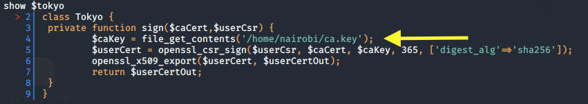 We get the path to the Certificate Authority (CA) key! Let’s dump the content of the file.