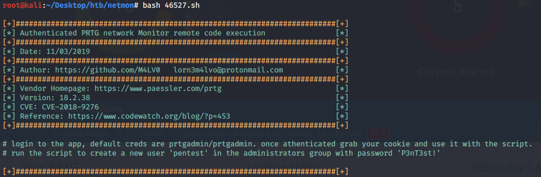 Known command injection vulnerability. The PRTG network monitoring tool is not itself vulnerable, however, the default installation comes with a test script that is vulnerable to a command injection. This is a known vulnerability that the administrator should have addressed when it was made public. The quick fix would have been to simply remove the test script form the notifications section.