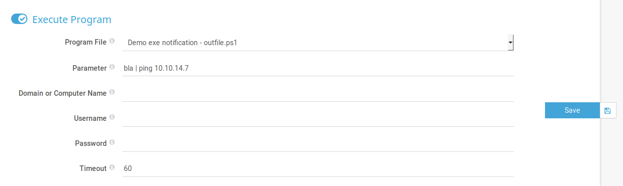 The notification system can be accessed through Setup > Account Settings > Notifications. Click on the Add new notification icon. Add ‘test’ as the Notification Name. Then click on execute Program and select the Program File outfile.ps1. In the Parameter field, let’s test out command injection by pinging our attack machine.