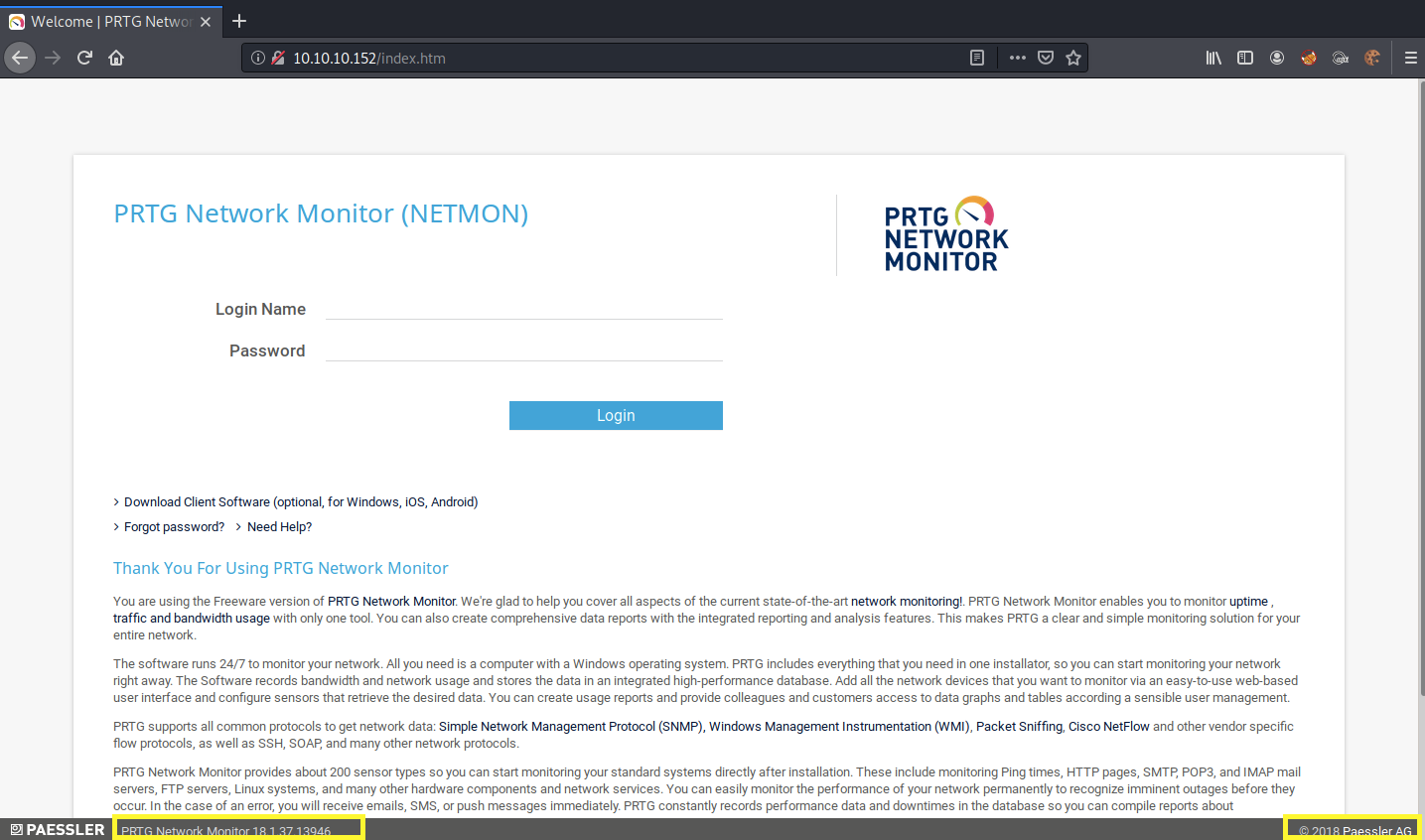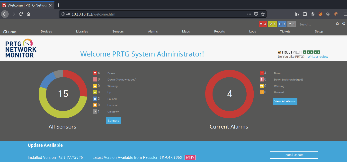 It’s running PRTG Network Monitor, which is a network monitoring software. The exact software version used is 18.1.37.13946. Since this is a network monitoring tool, chances are it is running with elevated privileges, so if the software contains an RCE, we’ll get a privileged shell.