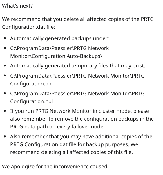 Cleartext credentials. A backup configuration file of the PRTG network monitoring tool contained cleartext credentials. As we saw in the reddit post, the company had sent its users an email warning them of exposed domain accounts and passwords. The administrator should have complied with the recommendation in the email and deleted the outlined files.