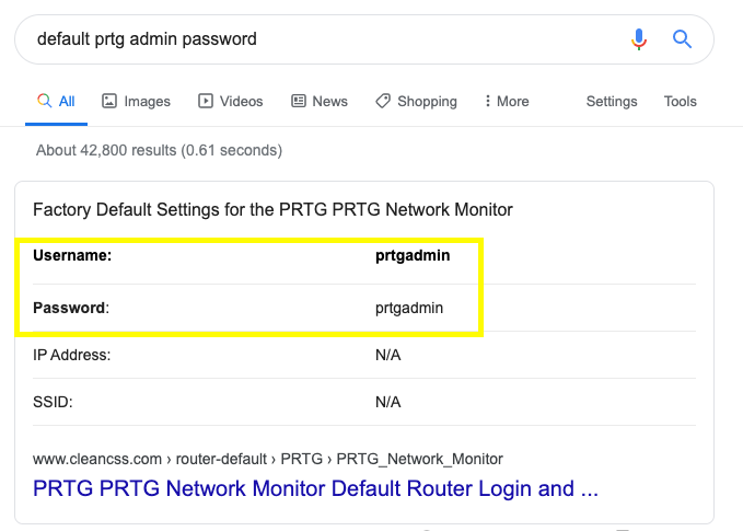 The first entry we see on google is a reddit post discussing an email sent by PRTG to its users about exposed domain accounts and passwords in plain text.