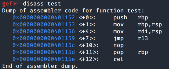 Since the first function argument needs to be in RDI, we need a ROP gadget that will copy “/bin/sh” into RDI. We can use the registers in the test function located at 0x401152, specifically the “mov rdi, rsp” and “jmp r13” instructions.