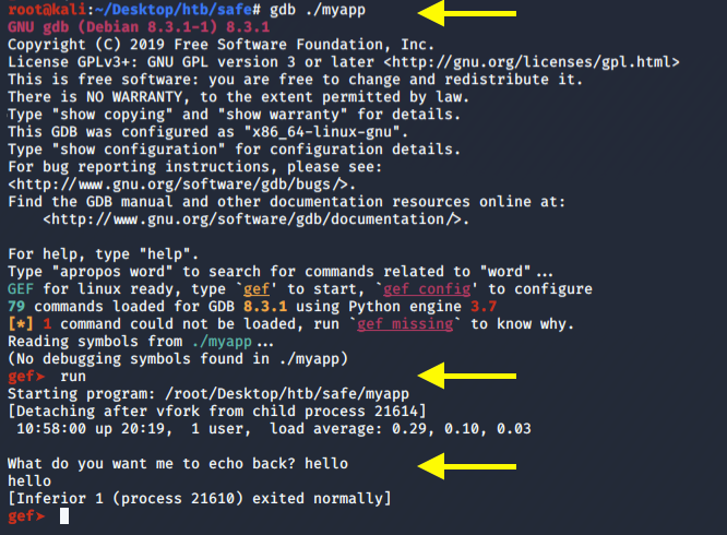 Go back to the GDB terminal and run the program again with the above input.