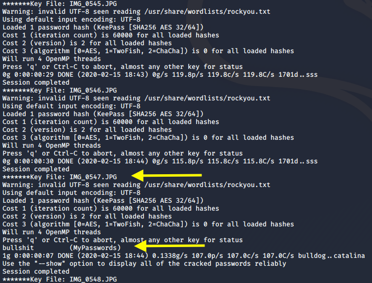 The above code loops through all the images as key files and generates the hash. Then it passes that hash to JtR. We get back the following result.