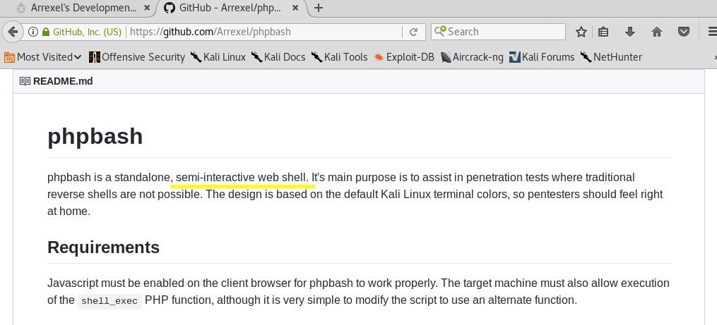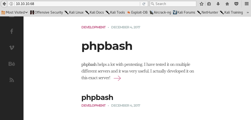 The arrow on the first page leads us to http://10.10.10.68/single.html. There, you can find a link to a GitHub repository explaining that this is a script used to create a semi-interactive web shell. Interesting! If we find the phpbash.php file, we can potentially get a web shell!