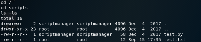 Now that weβre running in the context of scriptmanager, we have read/write/execute privileges in the scripts directory.