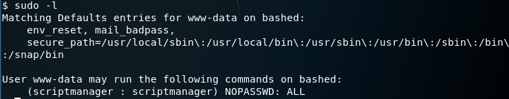The last two lines are particularly interesting because they say that the user Iβm running in the context of (www-data) can run as the user scriptmanager without having to provide the userβs password. This might come in handy later on.