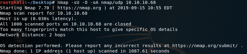 Similarly, we run an nmap scan with the -sU flag enabled to run a UDP scan.