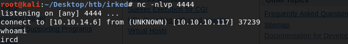 The next obvious step would be to get a reverse shell on the machine by exploiting the UnrealIRCd backdoor vulnerability. After attempting to do that, I spent an hour trying to figure out why neither my netcat reverse or bind shells are not working. It turns out that if you add the flag “-n” which stands for “do not do any DNS or service lookups on any specified address”, the shell doesn’t work. I’m not sure why. I’ll update this blog when I figure it out.