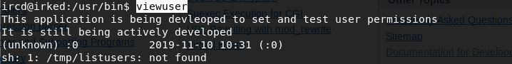 It seems to be running a file /tmp/listusers, however, the file does not exist. Since the SUID bit is set for this file, it will execute with the level of privilege that matches the user who owns the file. In this case, the file is owned by root, so the file will execute with root privileges.