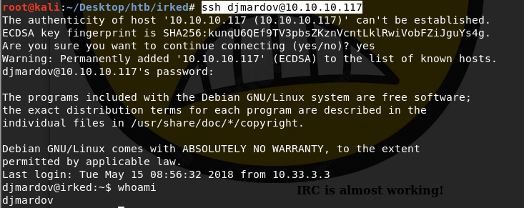 We’ll use that password to ssh into djmardov’s machine.