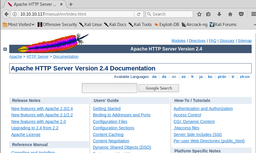 The /manual directory leads us to the default Apache HTTP server page.