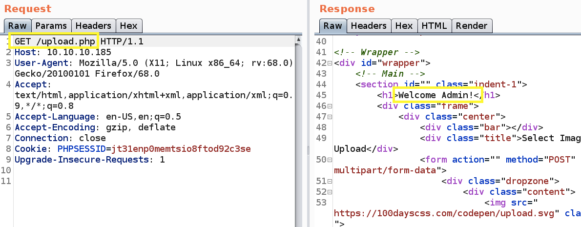 We can confirm this using Burp proxy. Visit the upload.php script and intercept the traffic in Burp. As can be seen in the below image, before the request is redirected to the login page, we are served with the upload page.