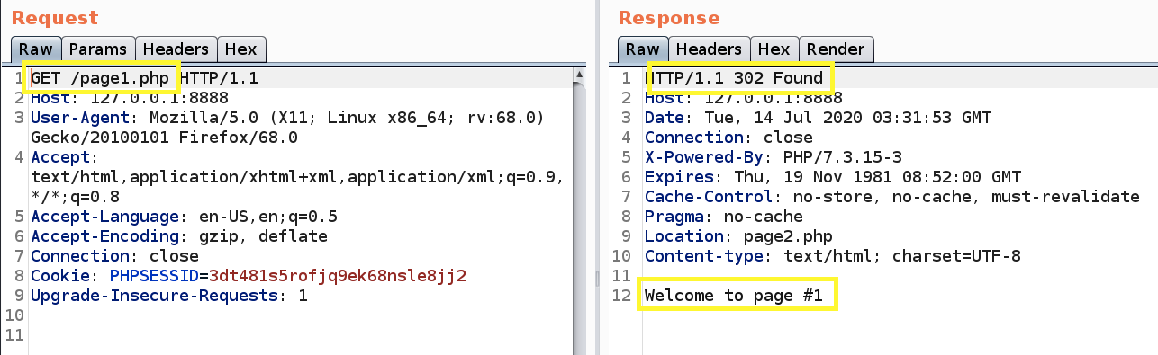 However, if we see the request in the proxy, we can see that before it redirects the user, the code in page 1 is rendered.