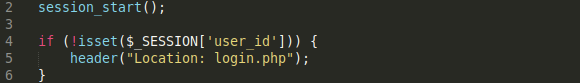 Lines 4–6: Call the isset function to check whether the user is logged in or not. This is done by checking if the user_id index of the global $_SESSION variable evaluating to anything other than null. If the user is not logged in, the header function gets called which redirects the user to the login page.