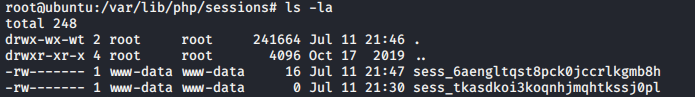 Sessions are saved in the following folder on the system. In the below image, the first session (sess_6aen…) was created by logging into the application using a valid username/password. Therefore, the size of the image is larger than zero b/c it contains session information. Whereas, the second session (sess_tkas...) was created by navigating to the upload.php script w/o logging in. Therefore, although the session got created, it does not contain any information.