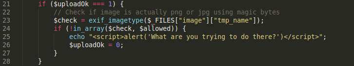 Line 23: Calls the exif_imagetype function which takes in the uploaded file and reads the first bytes of an image and checks its signature. When a correct signature is found, the appropriate constant value will be returned (1 for GIF, 2 for JPEG, 3 for PNG, etc.), otherwise the return value is False.