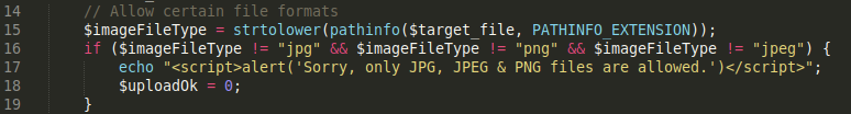 Line 15: Calls ****the pathinfo function which takes in the uploaded file and uses the option PATHINFO_EXTENSION to strip out the extension of the file and save it in the variable imageFileType. The thing to note about this option is that if the file has more than one extension, it strips the last one.