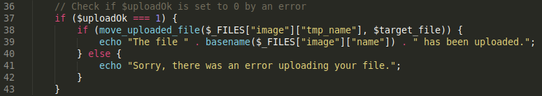 The remaining lines of the code upload the file in the directory images/uploads if the file passed the above two validation checks.