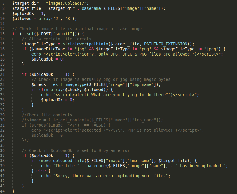 Lines 7–44 describe the upload functionality. We can see that there are two validation checks that are being performed, the first one checks the file format and the second checks the file type using magic bytes.