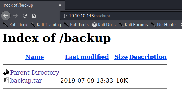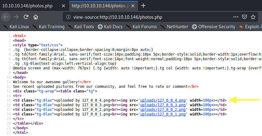 The nmap/gobuster/nikto scans on this web server showed several promising directories/files: /backup, /icons, /uploads, index.php, lib.php, photos.php, uploads.php, /icons/README.