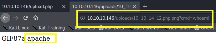 We can see that our image has been uploaded. Right click and select View Image. This executes our code. Next, add the cmd parameter to the URL and run the whoami command.